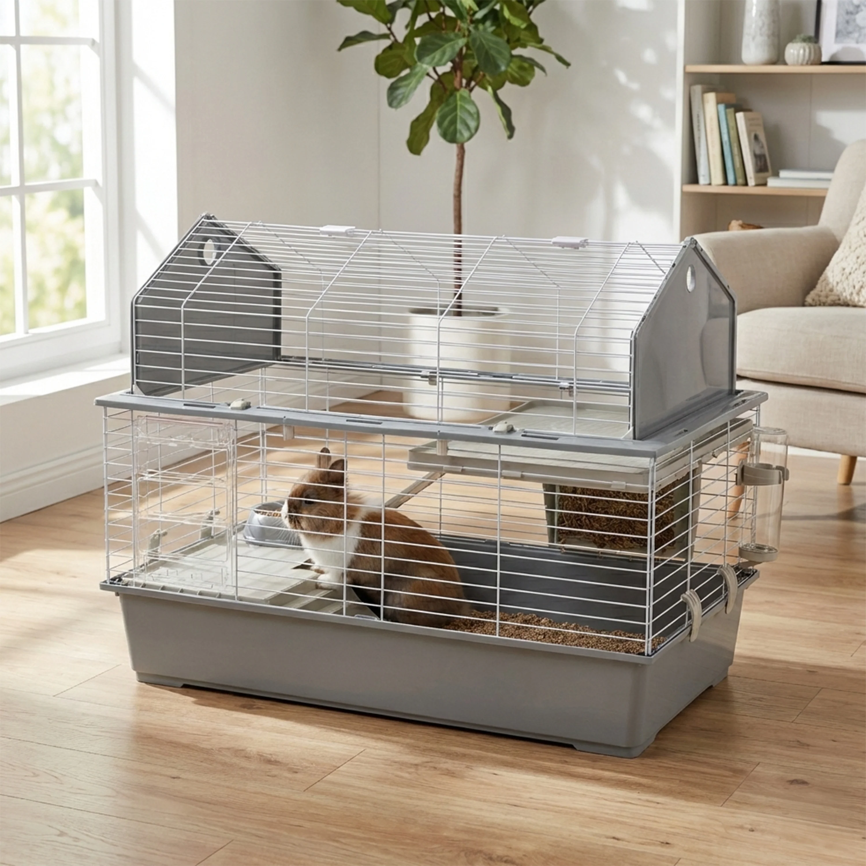 Barn 100 is reminiscent of an American barn thanks to the raised roof shape! Comfortable and spacious, this rabbit cage has plenty of room: on the lower floor, you will find a small rabbit house, perfect for moments of relaxation, while a plastic ladder leads upstairs where you will find the living area for your pet. The habitat is equipped with indispensable accessories such as feeder, bowl and drinker.