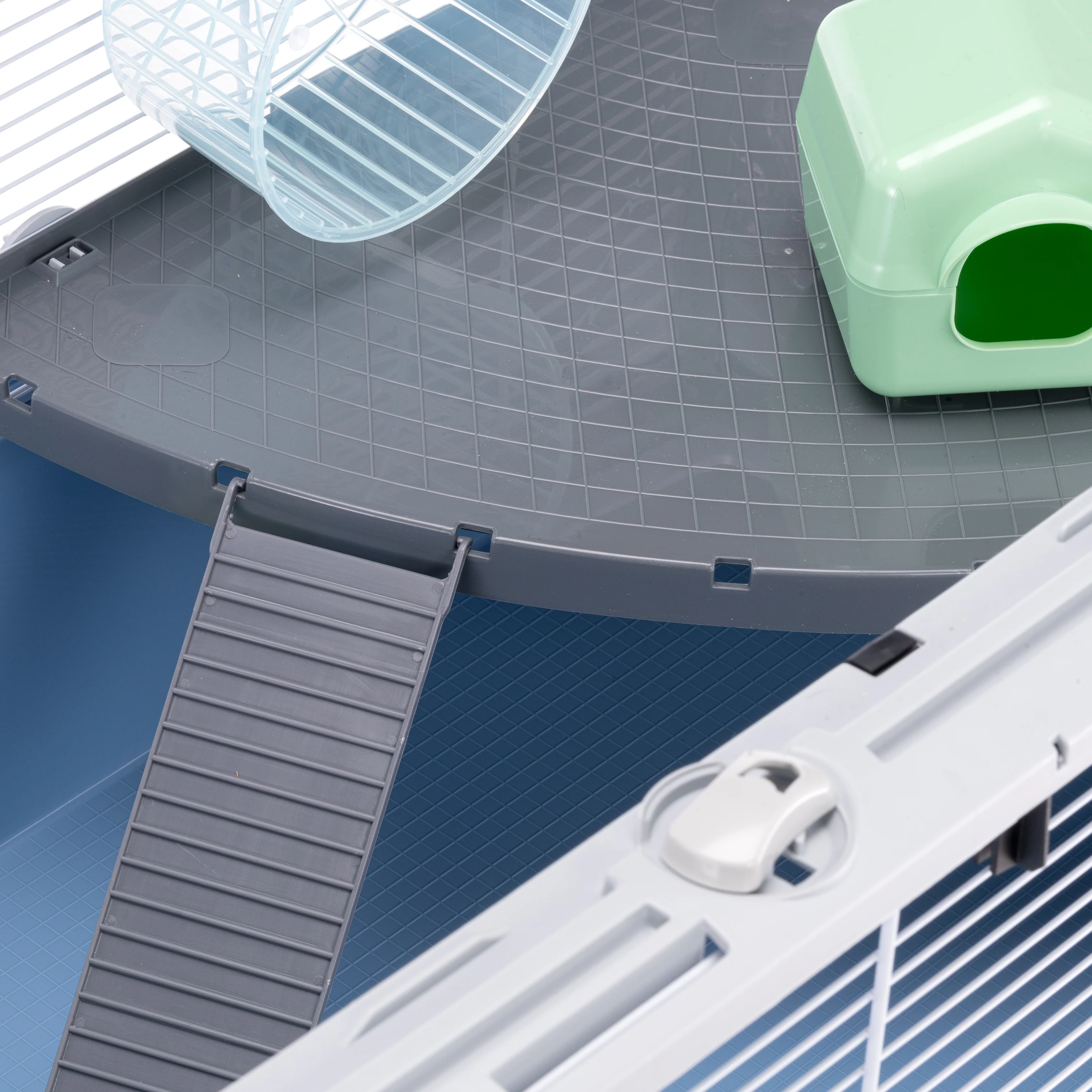 A spacious shelf with ladder divides the cage into two levels, designed for the different activities of your small rodent: the lower, quieter level is ideal for resting, while the upper level is perfect for eating, drinking and playing.
